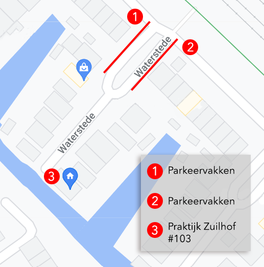 Aan het begin van het 2e hofje zijn er zowel links als rechts voldoende parkeerplaatsen. Hier(bij de rode lijn) kunt u gratis parkeren en is een blauwe parkeerkaart niet nodig. Het is dan nog 75 meter lopen naar de ingang van de praktijk.